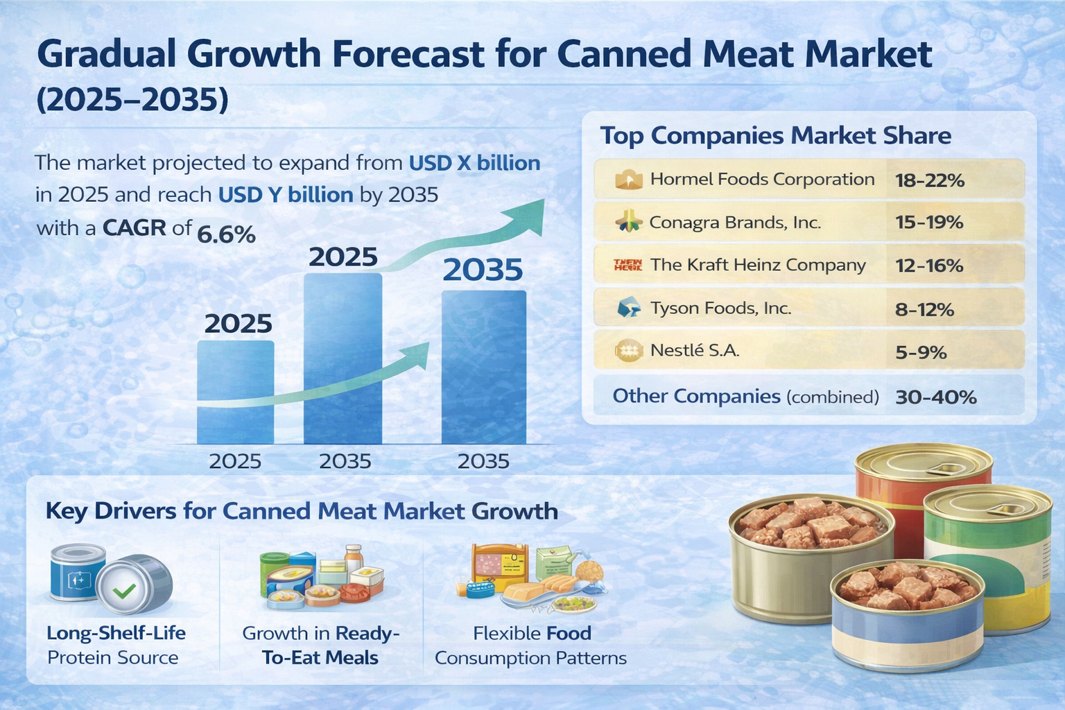 By 2035, the canned meat market is expected to reach a valuation of USD — billion (insert final figure if available), reflecting a healthy CAGR of 6.6%. This trajectory positions canned meat as a resilient and increasingly relevant segment within the broader packaged foods industry.
