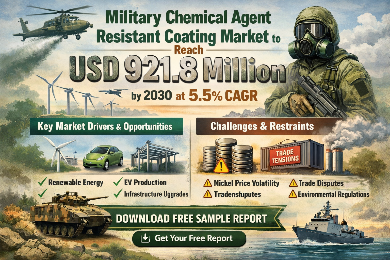 Global Military Chemical Agent Resistant Coating Market was valued at USD 645.3 million in 2023 and is projected to reach USD 921.8 million by 2030, exhibiting a Compound Annual Growth Rate (CAGR) of 5.5% during the forecast period (2023-2030). This growth is driven by increasing defense budgets worldwide and the need for advanced protective solutions against chemical warfare threats.