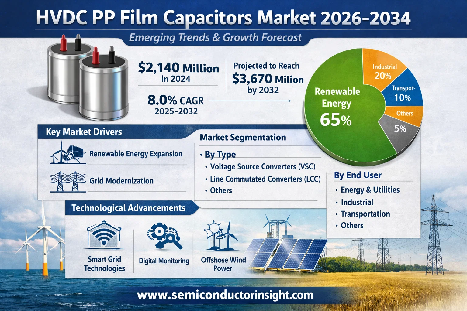 Global High Voltage Direct Current Polypropylene (HVDC PP) Film Capacitors Market, valued at USD 2,140 million in 2024, is projected to reach USD 3,670 million by 2032, growing at a CAGR of 8.0% during the forecast period 2025-2032. This robust growth trajectory is detailed in a comprehensive new report published by Semiconductor Insight, highlighting the indispensable role of these advanced components in modern power transmission infrastructure and renewable energy systems.