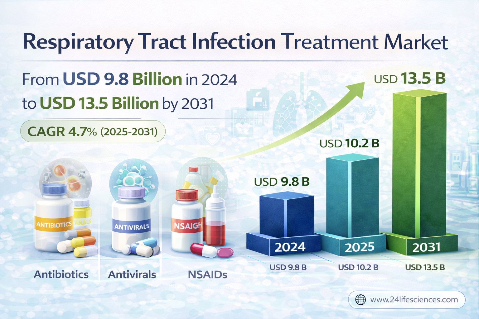 According to a newly published market research report by 24LifeSciences, global respiratory tract infection treatment market was valued at USD 9.8 billion in 2024 and is projected to reach USD 13.5 billion by 2031, growing at a compound annual growth rate (CAGR) of 4.7% during the forecast period 20252031.