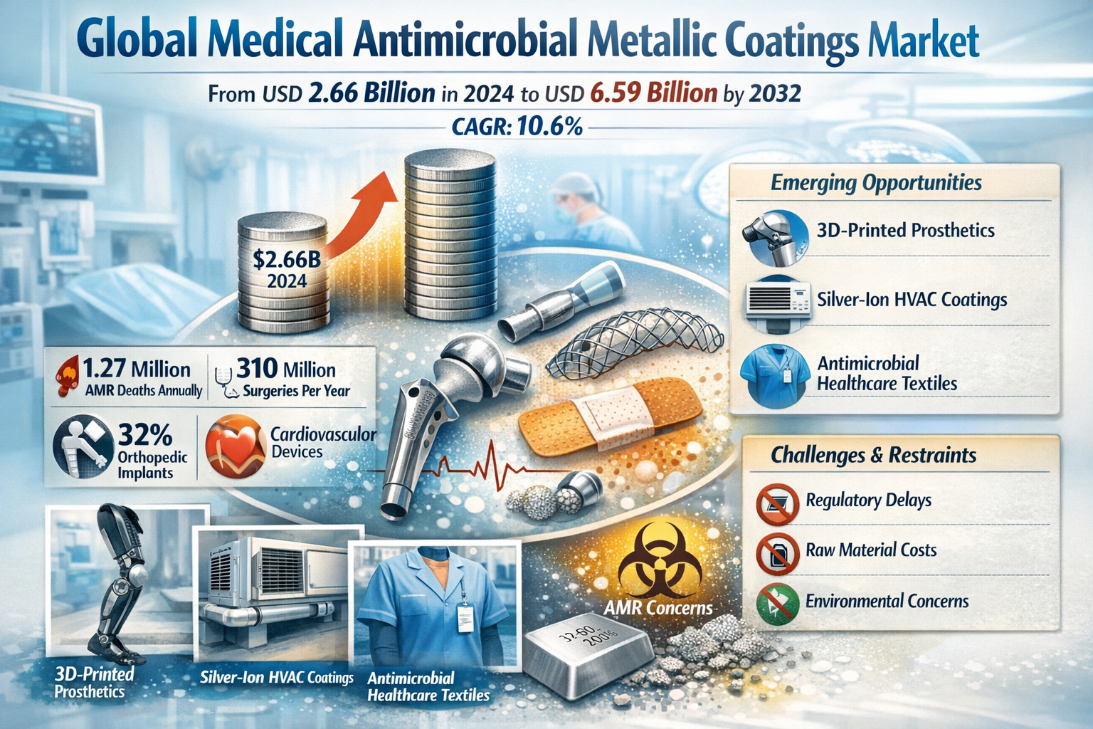 Global Medical Antimicrobial Metallic Coatings Market is experiencing robust expansion, currently valued at USD 2.66 billion in 2024 and projected to reach USD 6.59 billion by 2032, growing at a CAGR of 10.6%. This surge is fueled by escalating demand for infection-resistant medical devices in healthcare facilities, coupled with heightened awareness of hospital-acquired infections (HAIs) affecting over 1.4 million patients globally at any given time.