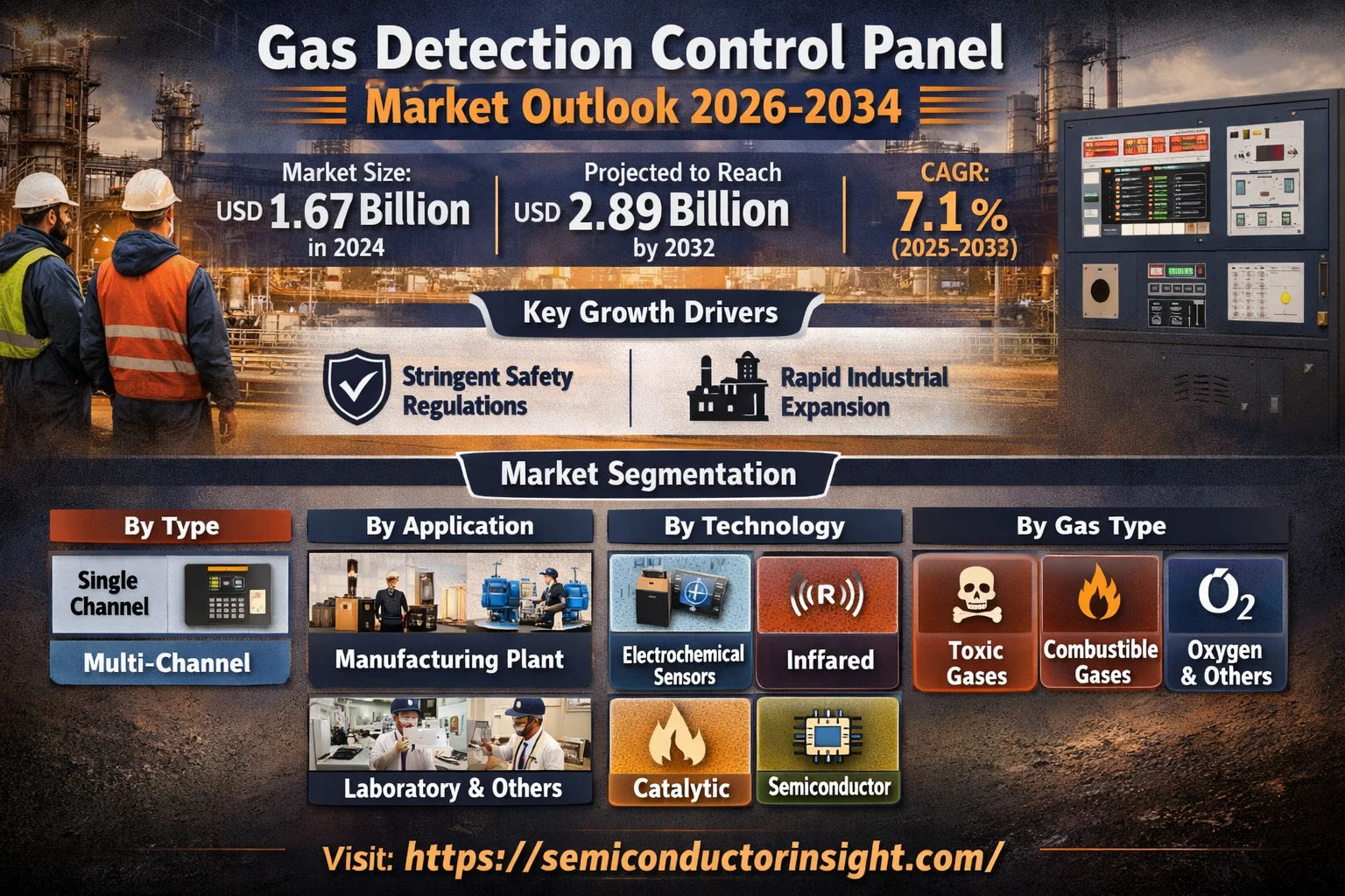 Global Gas Detection Control Panel Market, valued at a substantial USD 1.67 billion in 2024, is poised for robust expansion, projected to reach USD 2.89 billion by 2032. This growth trajectory, representing a compound annual growth rate (CAGR) of 7.1% during the forecast period 2025-2032, is detailed in a comprehensive new report published by Semiconductor Insight. The study underscores the indispensable role of these critical safety systems in protecting lives, assets, and the environment across a multitude of high-risk industries.