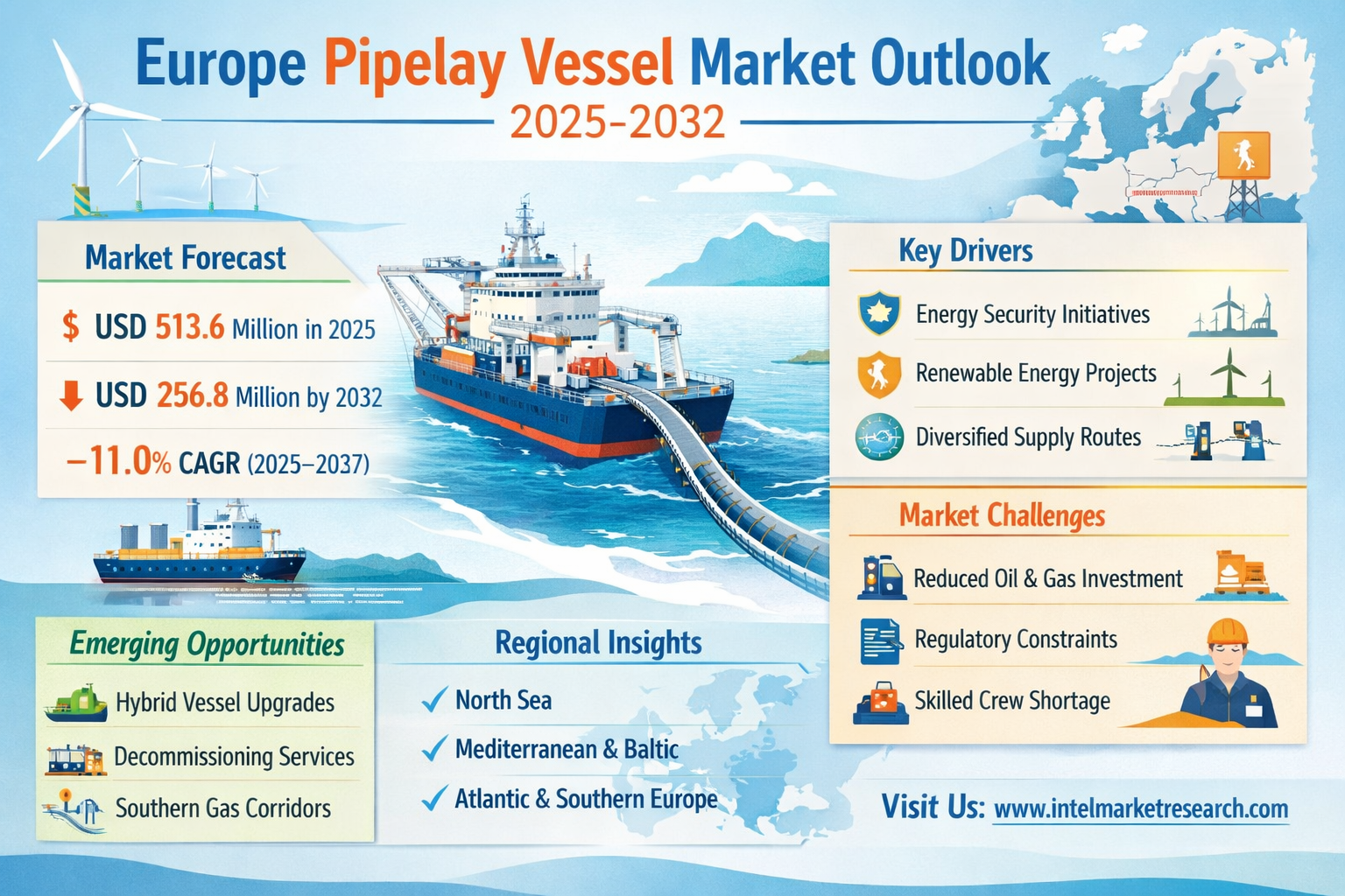 According to a new report from Intel Market Research, the Europe Pipelay Vessel Market was valued at USD 570 million in 2024 and is projected to decline from USD 513.6 million in 2025 to USD 256.8 million by 2032, exhibiting a negative compound annual growth rate (CAGR) of -11.0% during the forecast period (2025–2032). This contraction is primarily driven by a regional shift towards renewable energy sources, reduced investment in new offshore oil and gas projects, and evolving geopolitical dynamics reshaping Europe's energy infrastructure priorities.