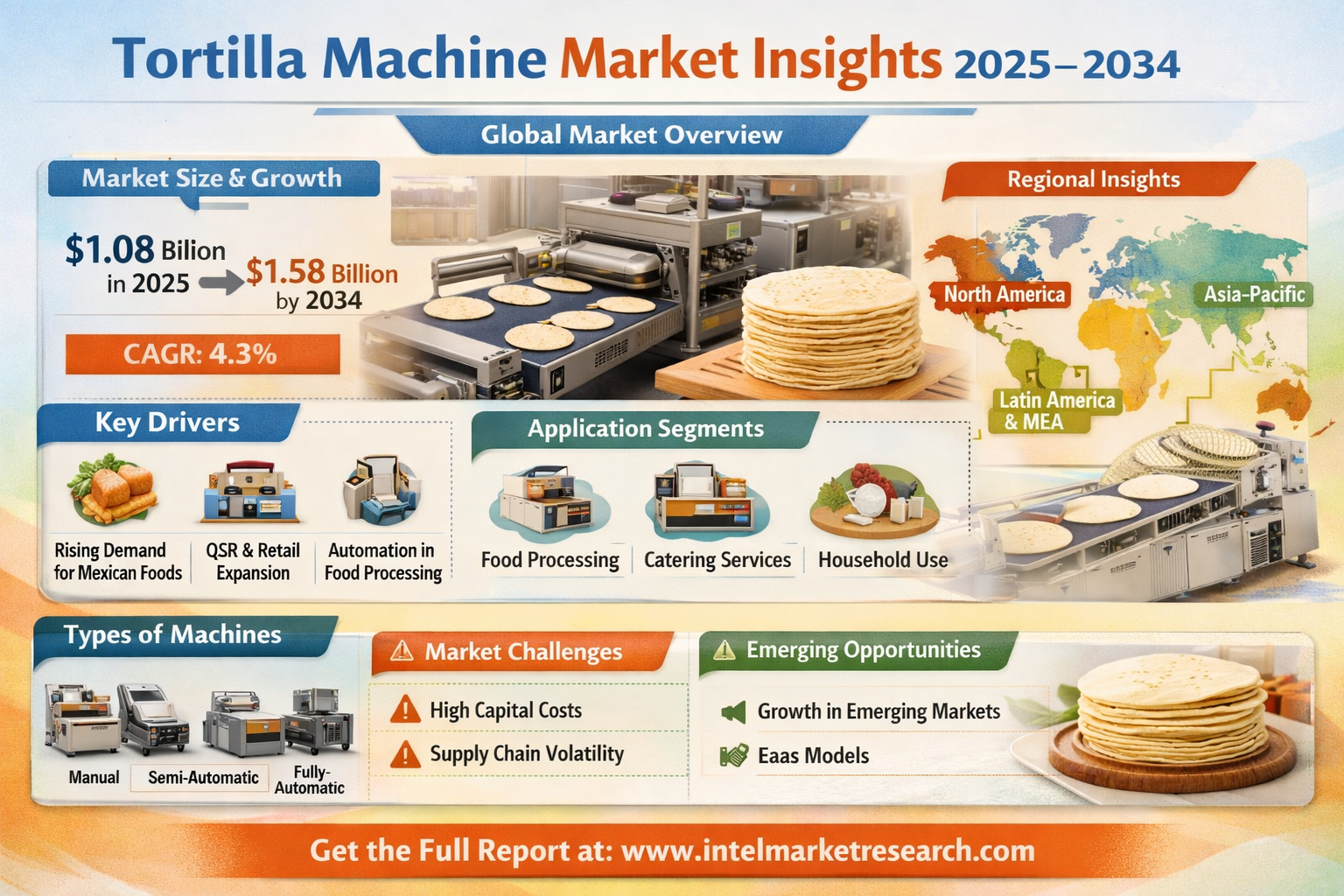 According to a new report from Intel Market Research, the global Tortilla Machine market was valued at USD 1.08 billion in 2025 and is projected to reach USD 1.58 billion by 2034, growing at a CAGR of 4.3% during the forecast period (2025–2034). This growth is propelled by the rising global consumption of Mexican-inspired foods, expansion of quick-service restaurants (QSRs) and retail packaged tortilla products, and increasing demand for automation in food processing to ensure consistency, hygiene, and higher output.