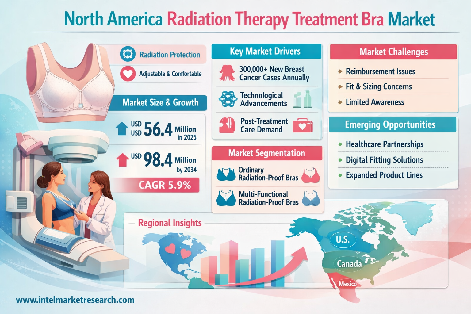According to a new report from Intel Market Research, the North America Radiation Therapy Treatment Bra Market was valued at USD 56.4 million in 2025 and is projected to reach USD 98.4 million by 2034, growing at a CAGR of 5.9% during the forecast period (2026–2034). This growth is propelled by increasing breast cancer incidence rates with approximately 300,000 new cases annually in the United States, technological advancements in radiotherapy techniques, and rising awareness about post-treatment care solutions.