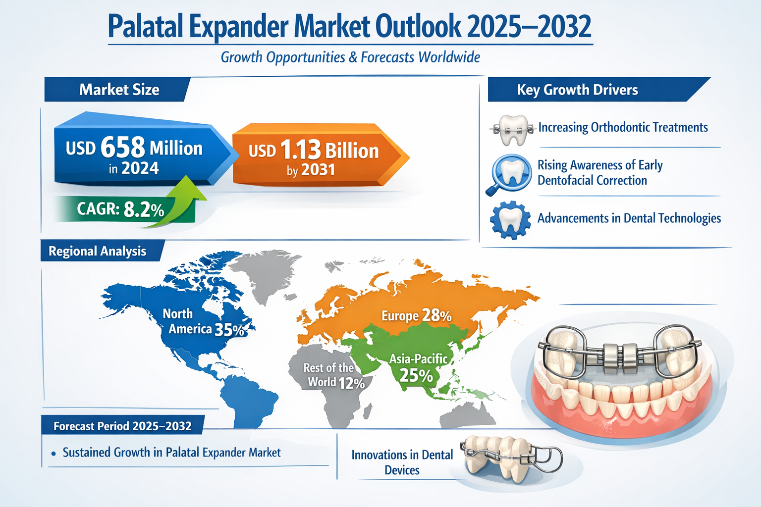 Palatal Expander Market Regional Analysis, Demand Analysis and Competitive Outlook 2025–2032, the global palatal expander market was valued at USD 658 million in 2024 and is projected to reach USD 1.13 billion by 2031, growing at a compound annual growth rate (CAGR) of 8.2% during the forecast period. This sustained expansion reflects increasing demand for orthodontic treatments, rising awareness of early dentofacial correction, and ongoing innovation in dental device technologies.