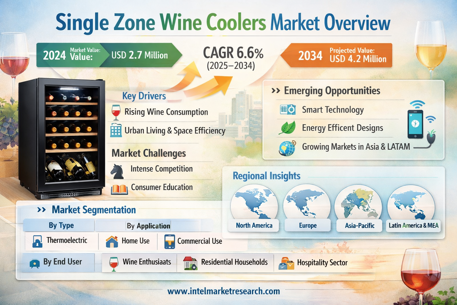 According to a new report from Intel Market Research, the global Single Zone Wine Coolers market was valued at USD 2.7 million in 2024 and is projected to reach USD 4.2 million by 2034, growing at a robust CAGR of 6.6% during the forecast period (2025–2034). This growth is propelled by rising wine consumption globally, particularly among younger demographics in key markets like North America and Europe, and technological advancements such as energy-efficient compressors and smart connectivity features.