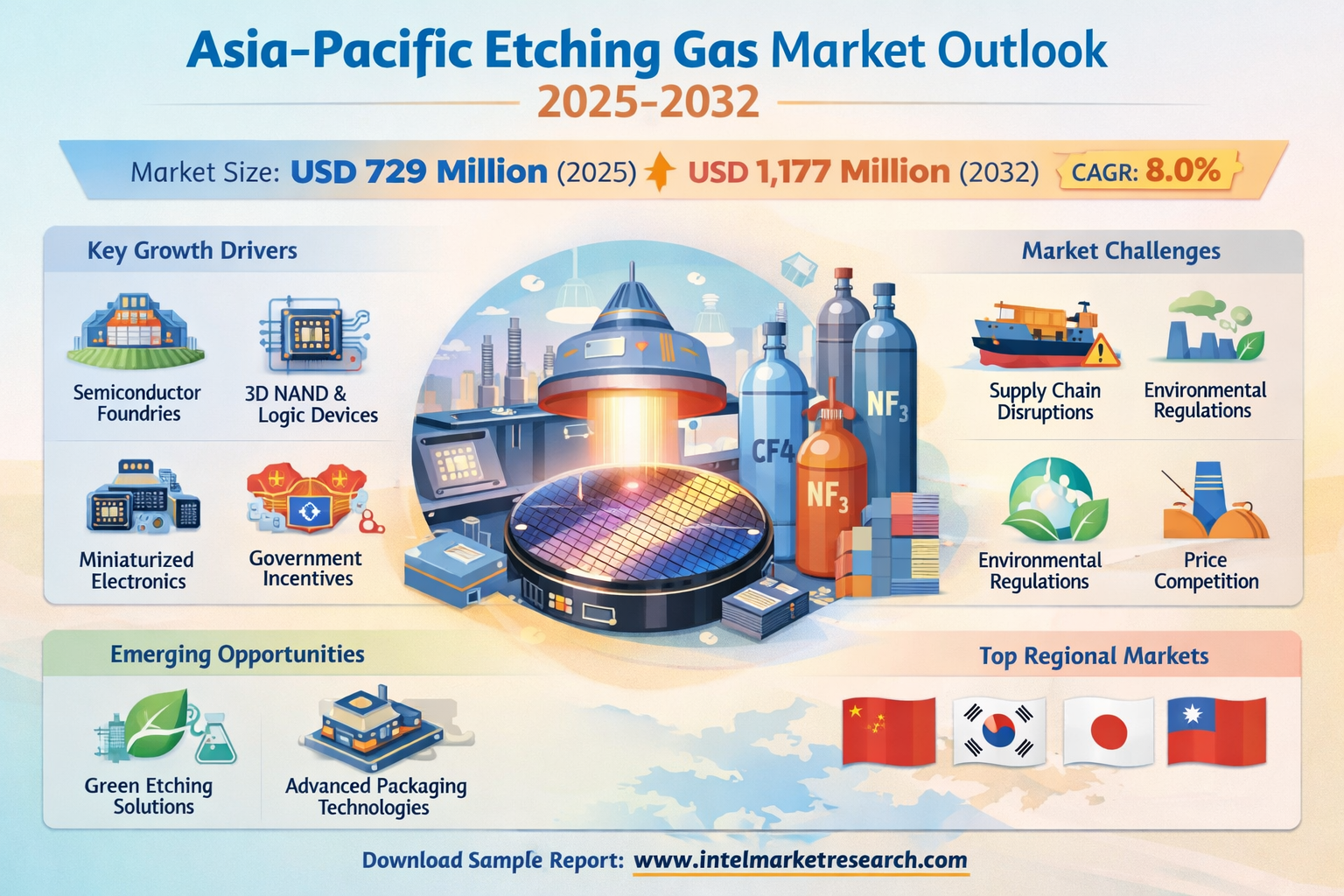 According to a new report from Intel Market Research, the Asia-Pacific Etching Gas Market was valued at USD 675 million in 2024 and is projected to reach USD 1,177 million by 2032, growing from USD 729 million in 2025 at a CAGR of 8.0% during the forecast period (2025–2032). This growth is propelled by the expansion of semiconductor foundries, rising demand for miniaturized electronic components, advancements in 3D NAND and logic device manufacturing, the region's dominance in global semiconductor production accounting for over 70% of capacity, and government incentives in countries like Taiwan, South Korea, and China.
