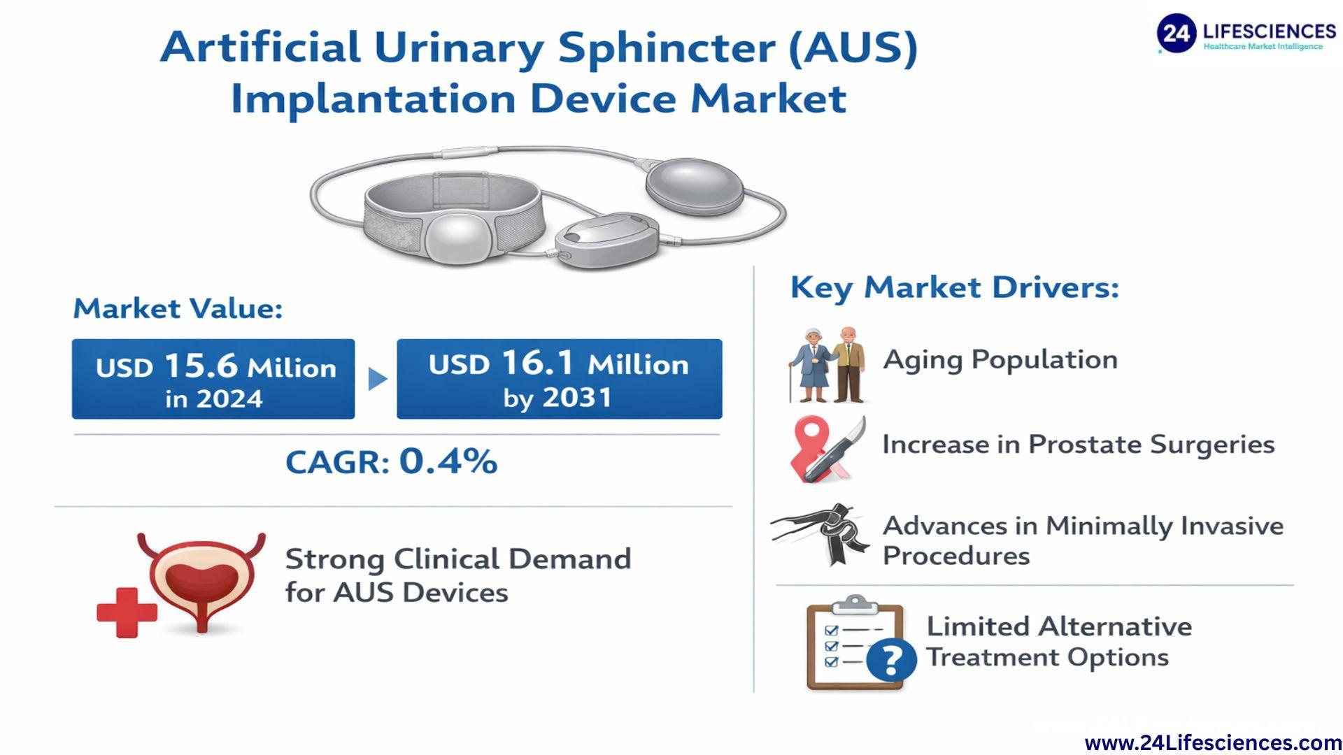 The Artificial Urinary Sphincter (AUS) Implantation Device Market continues to play a vital role in the management of severe stress urinary incontinence, particularly among men with post-prostatectomy complications. According to the latest market analysis, the global AUS implantation device market was valued at USD 15.6 million in 2024 and is projected to reach USD 16.1 million by 2031, growing modestly at a CAGR of 0.4% during the forecast period.