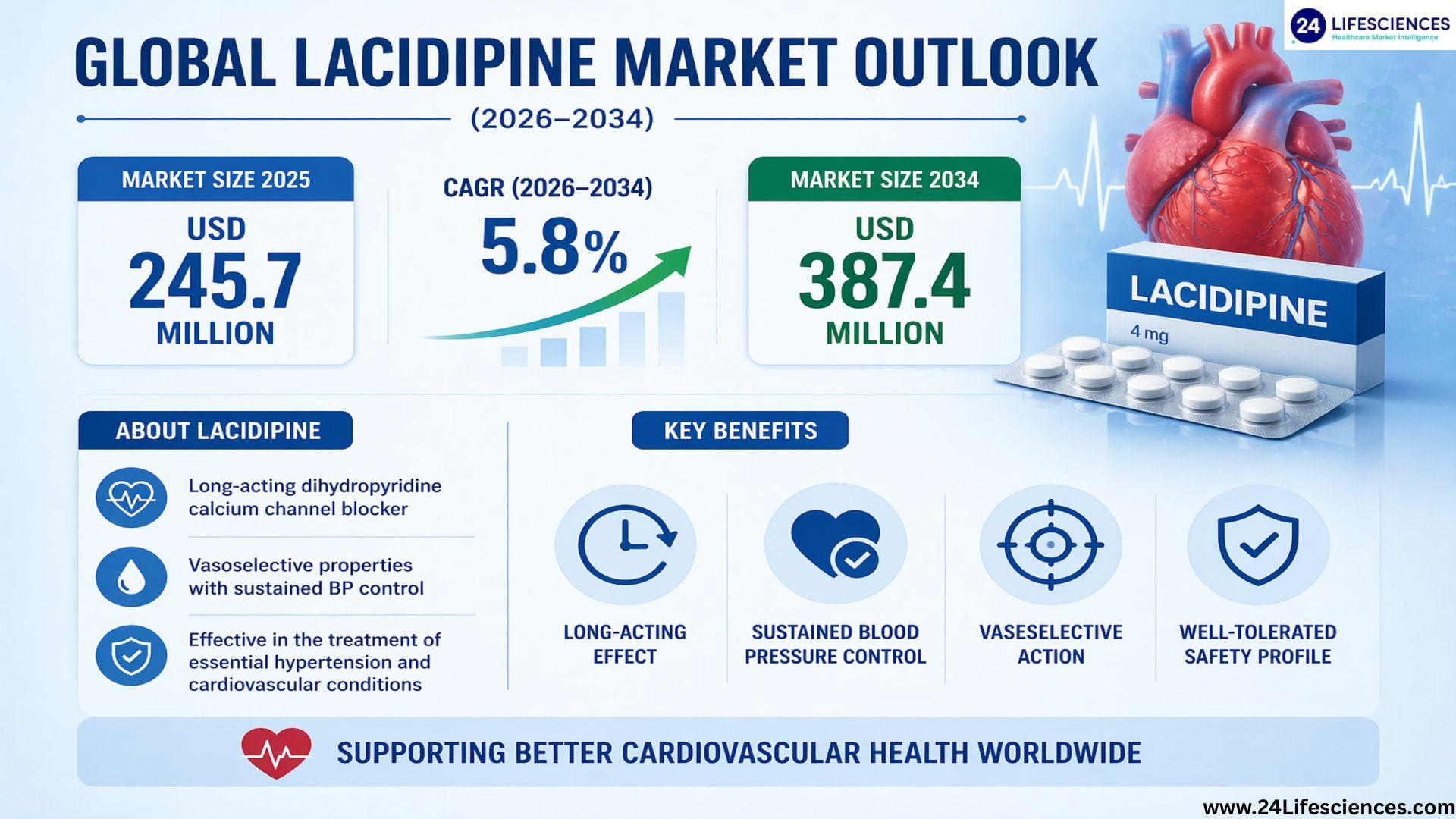 According to a newly published market research report by 24LifeSciences, global lacidipine market was valued at USD 245.7 million in 2025 and is projected to reach USD 387.4 million by 2034, growing at a compound annual growth rate (CAGR) of 5.8% during the forecast period 20262034.