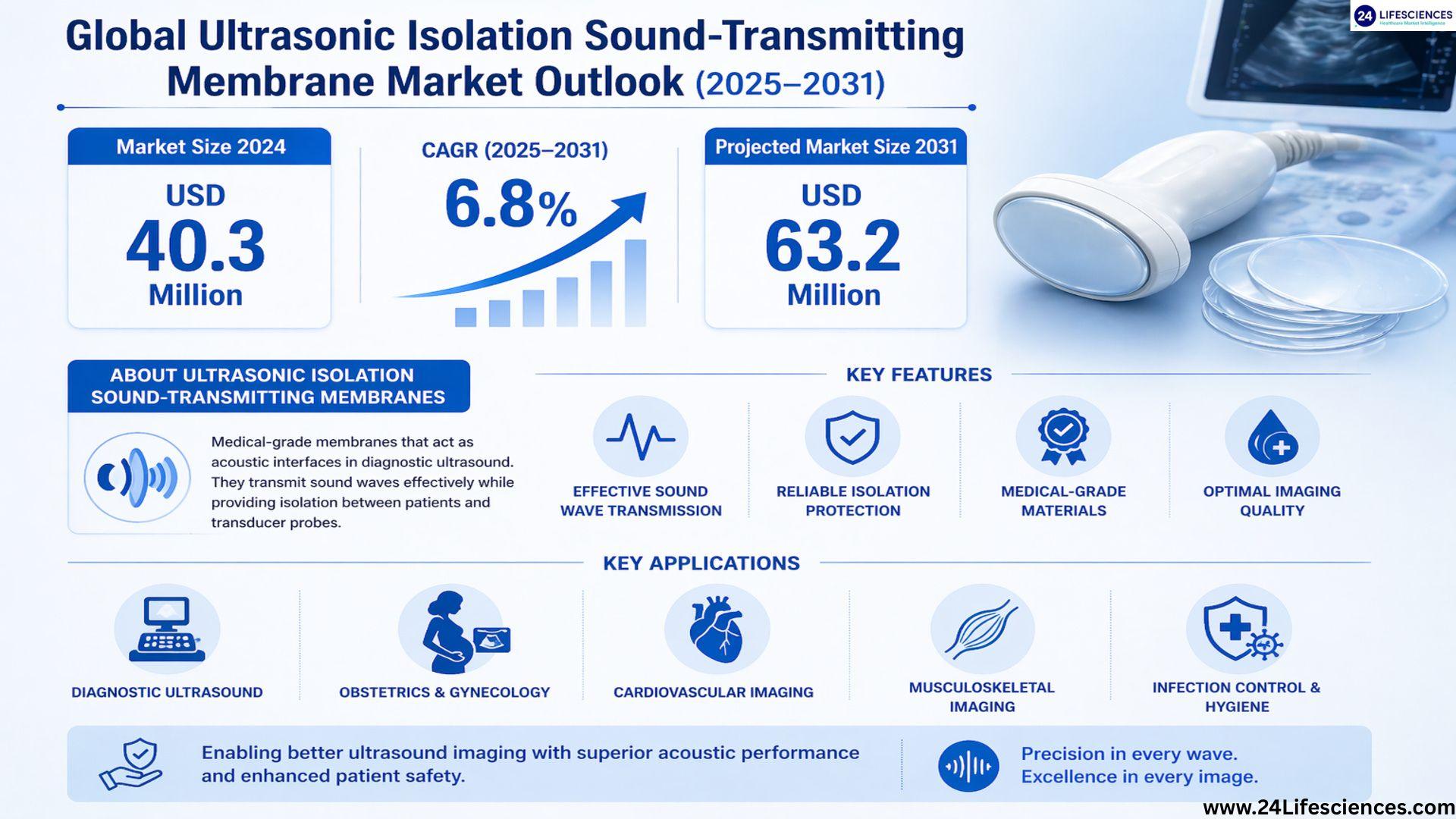 According to a newly published market research report by 24LifeSciencesglobal ultrasonic isolation sound-transmitting membrane market was valued at USD 40.3 million in 2024 and is projected to reach USD 63.2 million by 2031, growing at a compound annual growth rate (CAGR) of 6.8% during the forecast period 2025-2031.