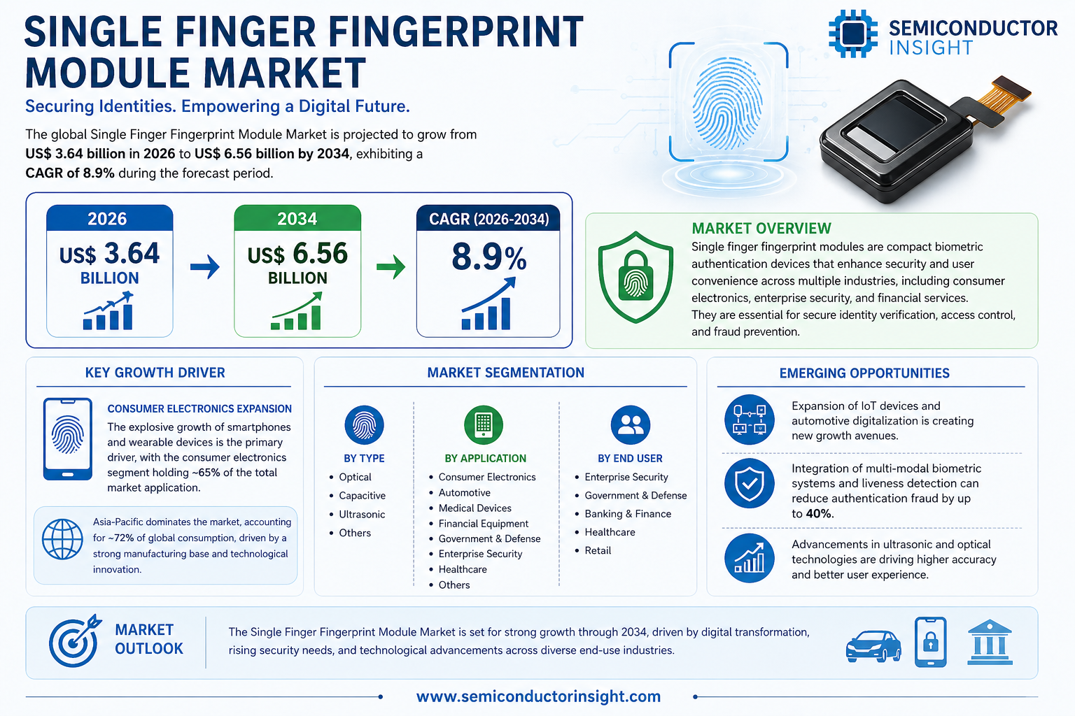 Global Single Finger Fingerprint Module Market, valued at US$ 3.64 billion in 2024, is poised for substantial expansion, projected to reach US$ 6.56 billion by 2032. This growth, representing a compound annual growth rate (CAGR) of 8.9%, is detailed in a comprehensive new report published by Semiconductor Insight. The study highlights the critical role of these biometric authentication devices in enhancing security and user convenience across multiple industries, particularly consumer electronics and enterprise security.