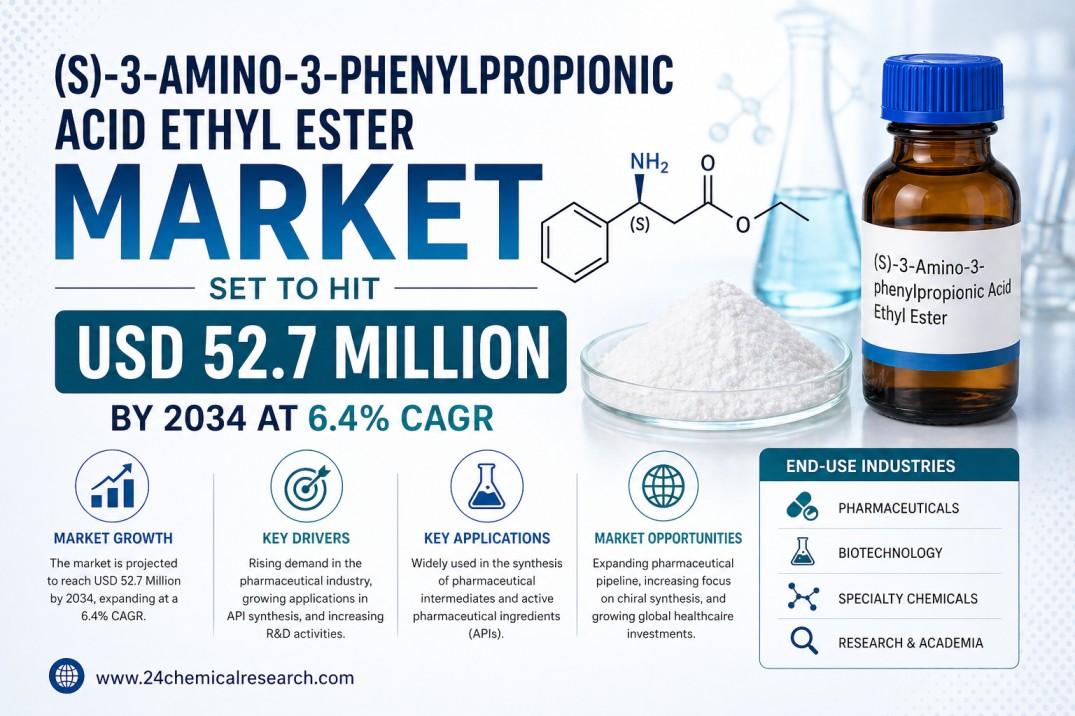 (S)-3-Amino-3-phenylpropionic Acid Ethyl Ester Market Set to Hit USD 52.7 Million by 2034 at 6.4% CAGR Global (S)-3-Amino-3-phenylpropionic acid ethyl ester market was valued at USD 28.4 million in 2025 and is projected to reach USD 52.7 million by 2034, exhibiting a remarkable CAGR of 6.4% during the forecast period.
